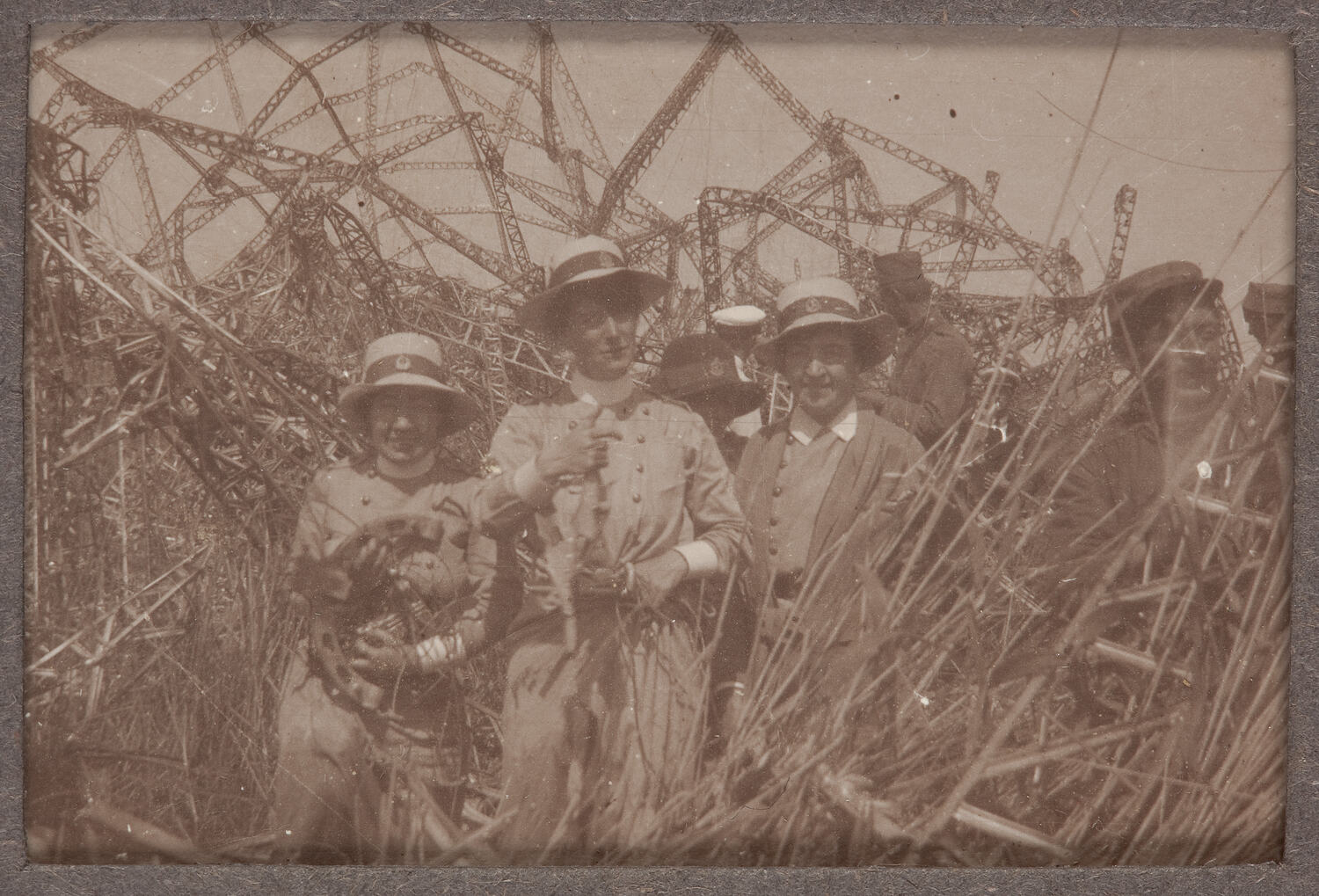 Portrait of three nurses standing amid a wreckage. They appear to be souveniring parts.