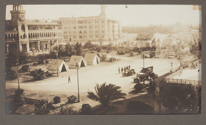Hospital Tents at Heliopolis Palace Hotel. Courtyard in foreground, three tents to the left, buildings to far left. Soldiers and motorcars to the right in foreground.