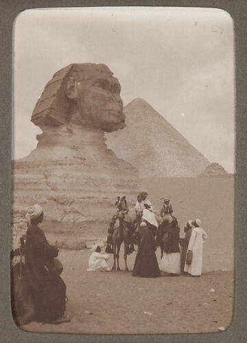 Group portrait showing three nurses on camels in front of the Great Sphinx of Giza. A group of men are pictured standing around the camels. The Pyramid of Khafre is pictured in the background.