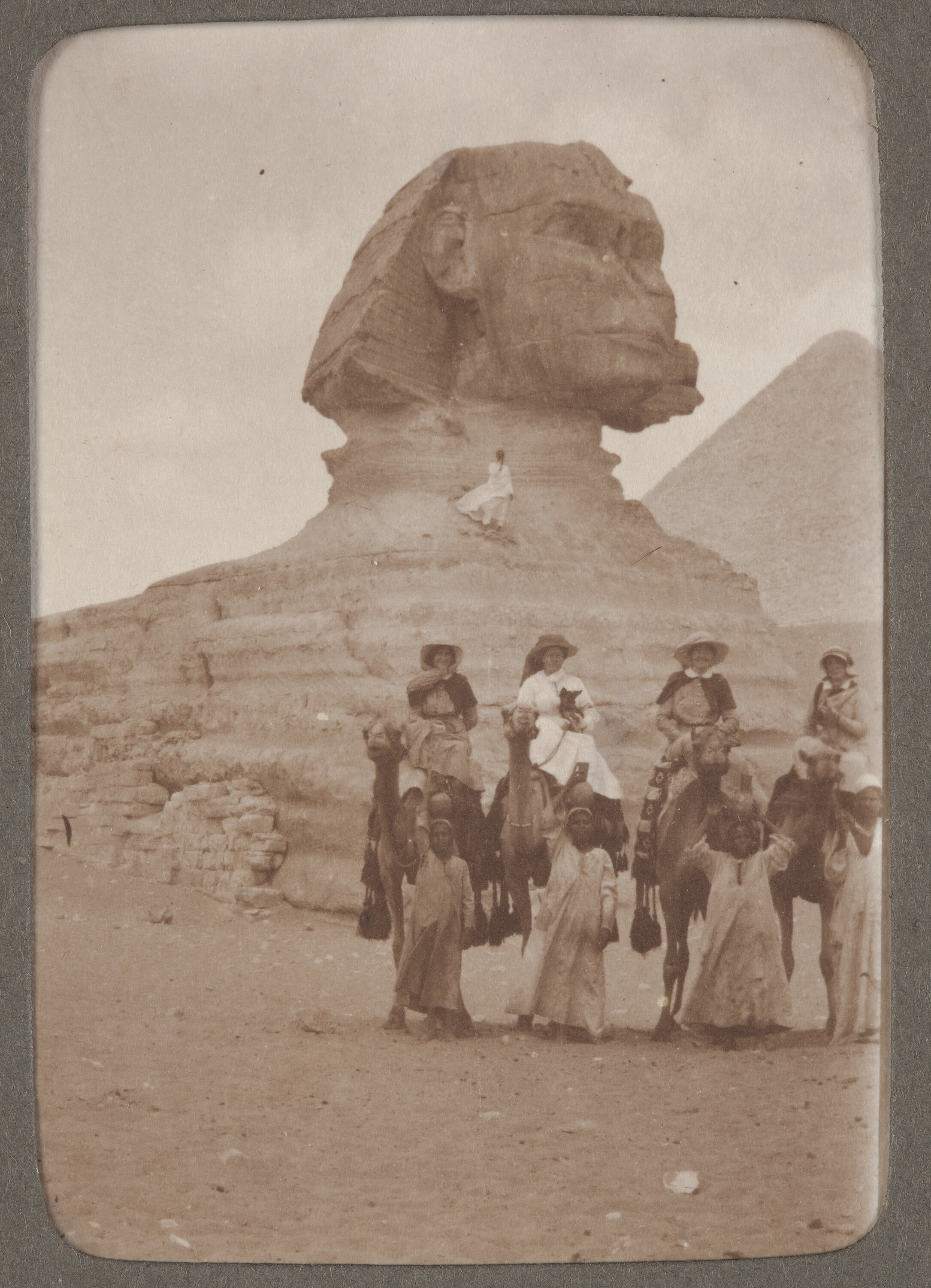 Group portrait showing four nurses on camels in front of the Great Sphinx of Giza. Four men are pictured standing with the camels, a fifth man is shown standing in the background. The Pyramid of Khafre is pictured in the background.