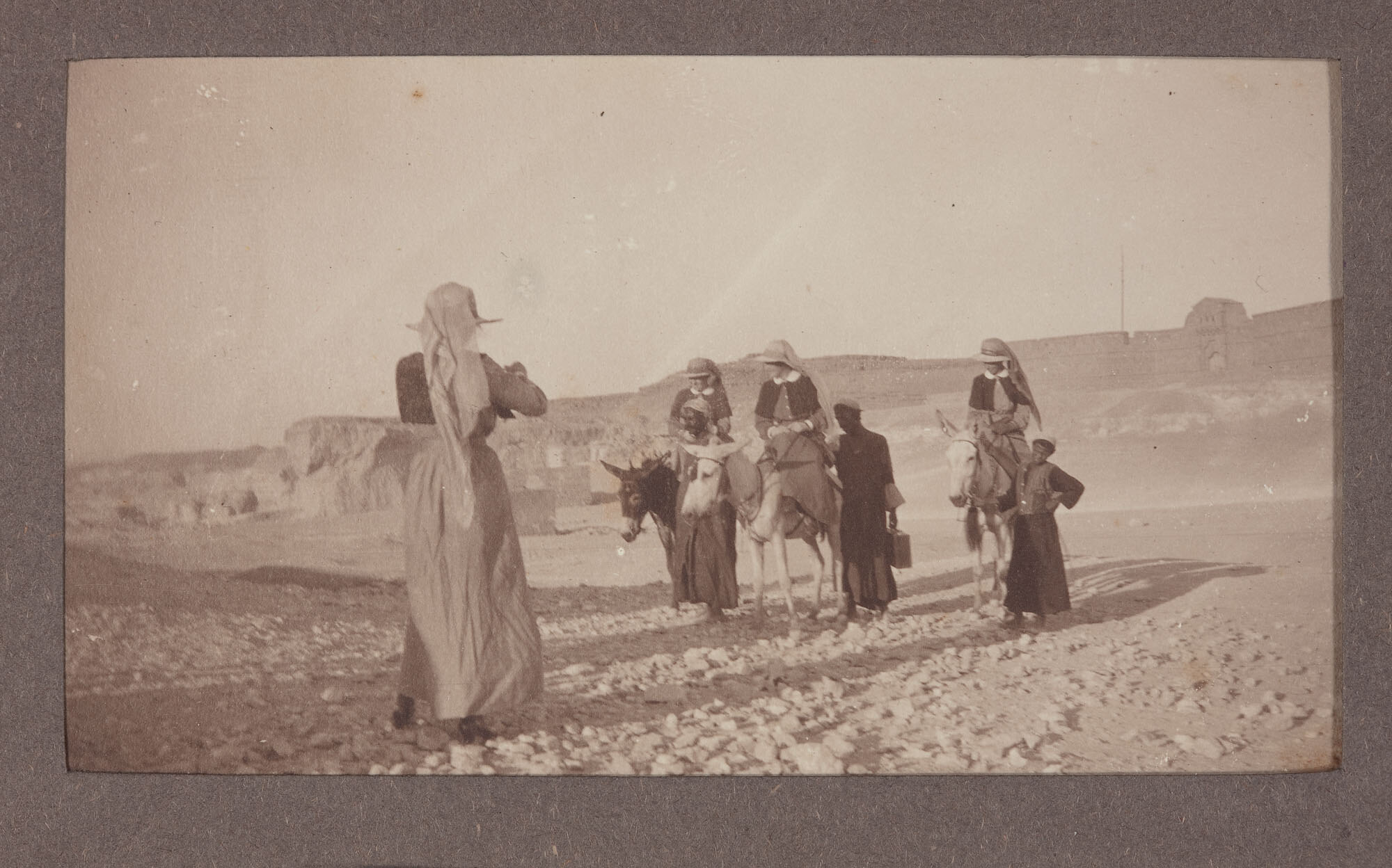 Three nurses on donkeys, aided by two men, another nurse standing with her back to the camera to the right. Desert landscape.