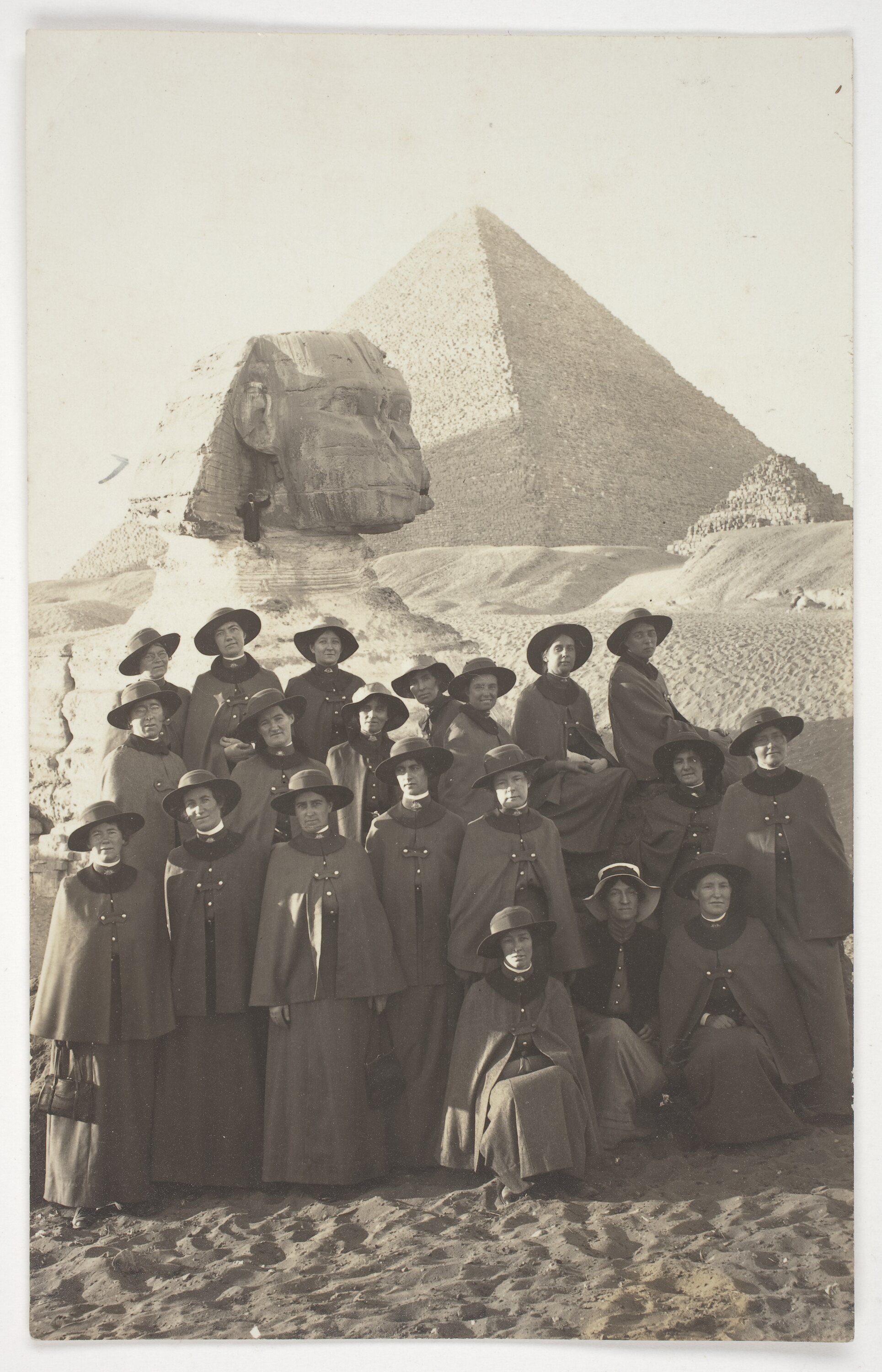 Group portrait of 20 nurses in front of the Great Sphinx of Giza. The Pyramid of Khafre is pictured in the background.