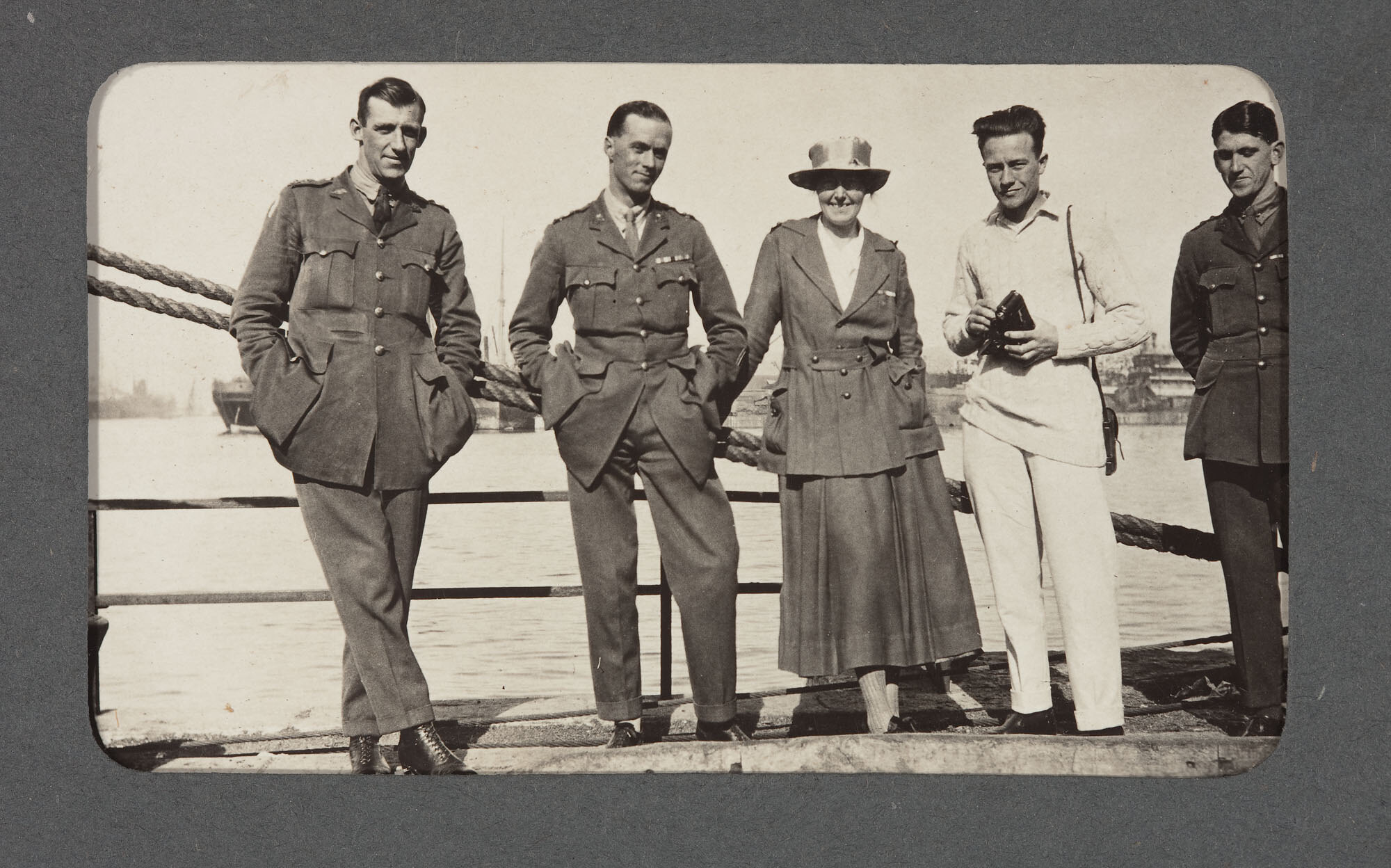 Portrait of group of four men (three in military uniform) and one woman. Woman in centre, all standing and facing camera, water visible in background.