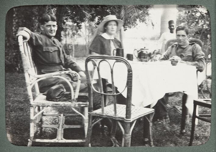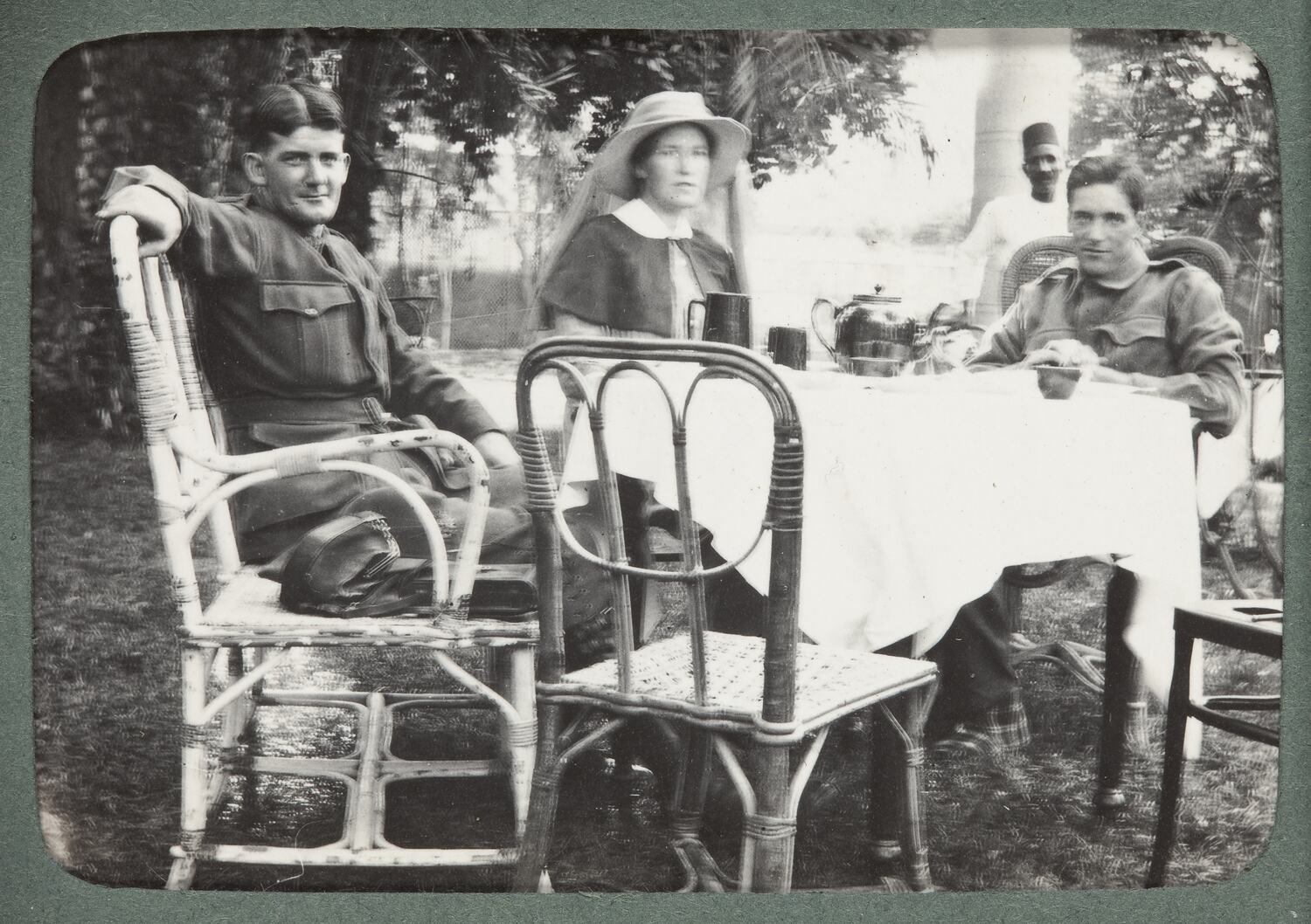 Two soldiers and a nurse sitting at a table outdoors. A servant is pictured in the background.