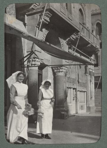 Two nurses standing on a street out the front of Heliopolis Dairy building.