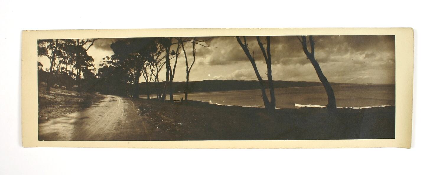 Panoramic photograph of a seascape with a dirt road at left in foreground sweeping around a bay at right. Gum trees follow the road on both sides, and waves can be seen breaking onto the beach.