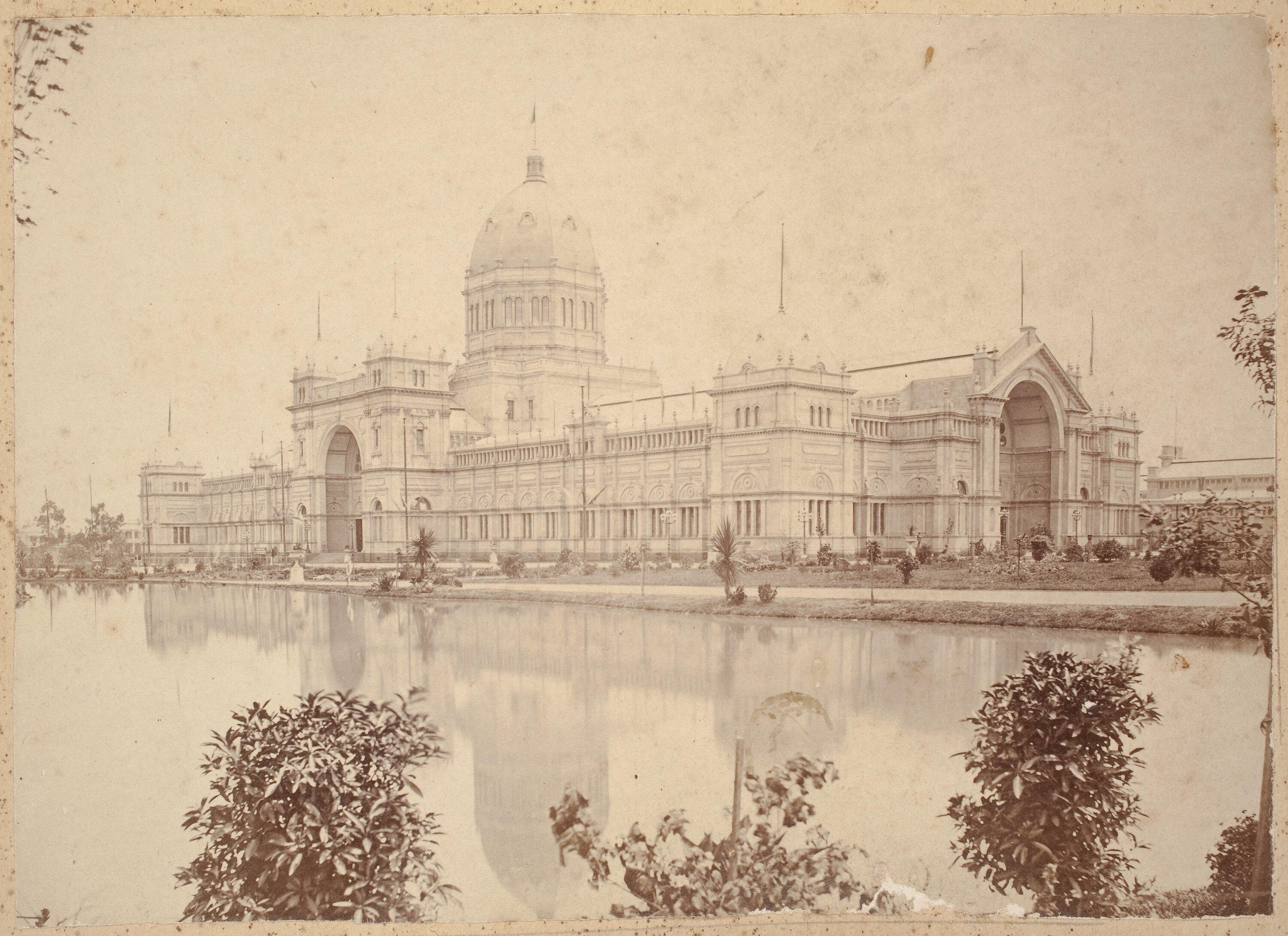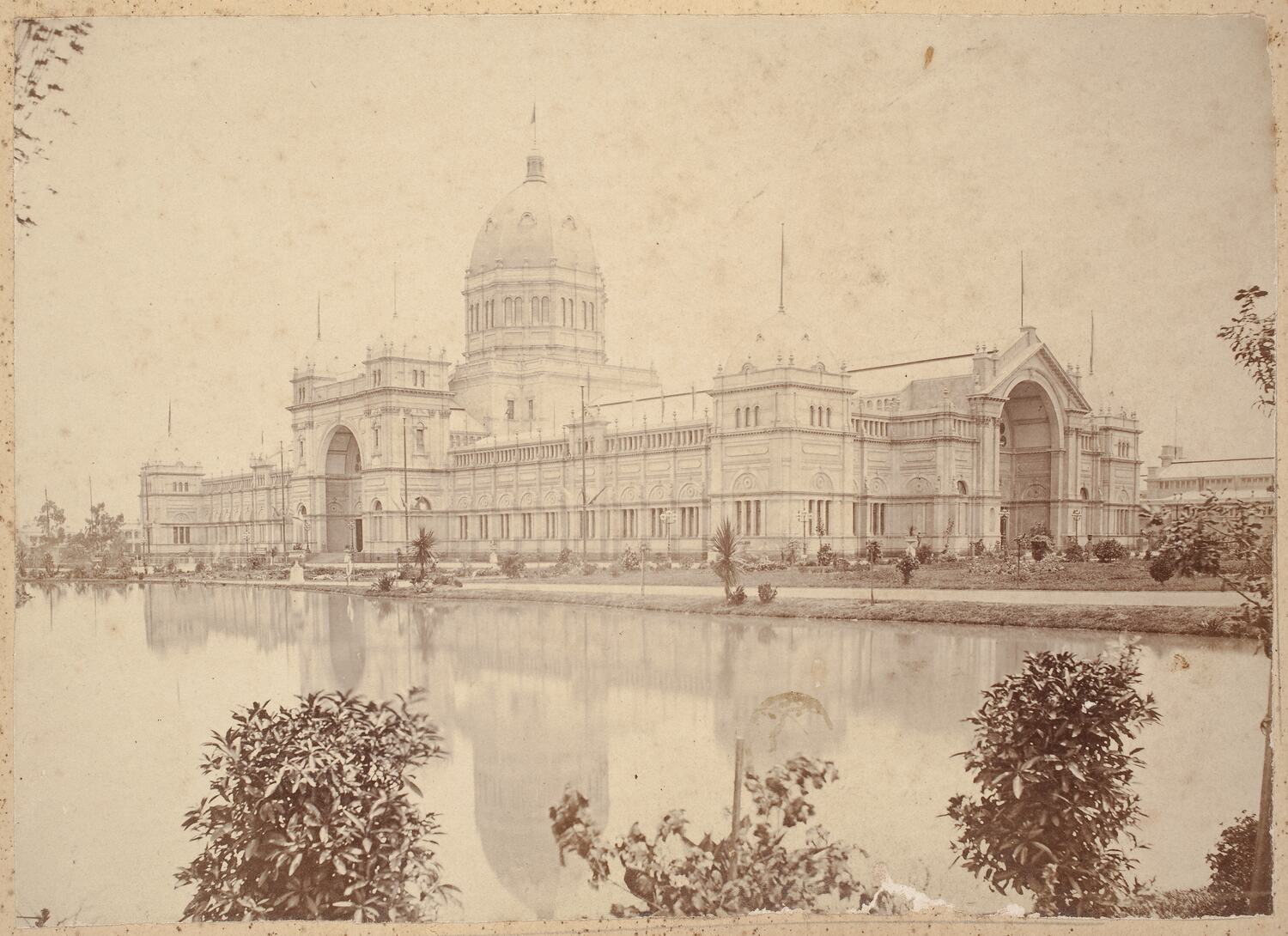 View of the Exhibition Building looking north-west from Nicholson Street taken at the time of the 1880 Melbourne International Exhibition. The original ornamental lake is visible in the foreground.