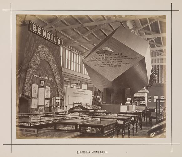 Victoria had courts in the Great Hall of the main Exhibition Building, as well as in the central temporary annexes and in the Eastern Annexe, or Machinery Annexe. The display of mining exhibits, so central to Victoria's prosperity over the preceeding decades, was housed in the temporary annexe court. One of its most striking exhibits, seen in this photograph, was the rhombic dodecahedron representing the total bulk of gold raised in Victoria up until the 30 June 1880. It represented the 49,096,408 ounces, or 1503 tons of gold that had been extracted from Victorian goldfields, with a value of £196,393,632. A very similar engraved illustration of this view, also showing the rhombic dodecahedron, appeared in the Australasian Sketcher on 6 November 1880, p. 296.