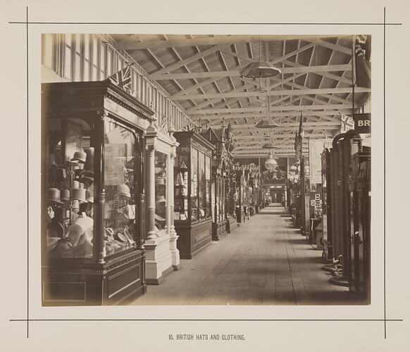 View of the display of hats and clothing in the British Court in the central temporary annexe on the western side of the main avenue at the 1880 Melbourne International Exhibition held at the Exhibition Buildings, Carlton Gardens, between 1 October 1880 and 30 April 1881.