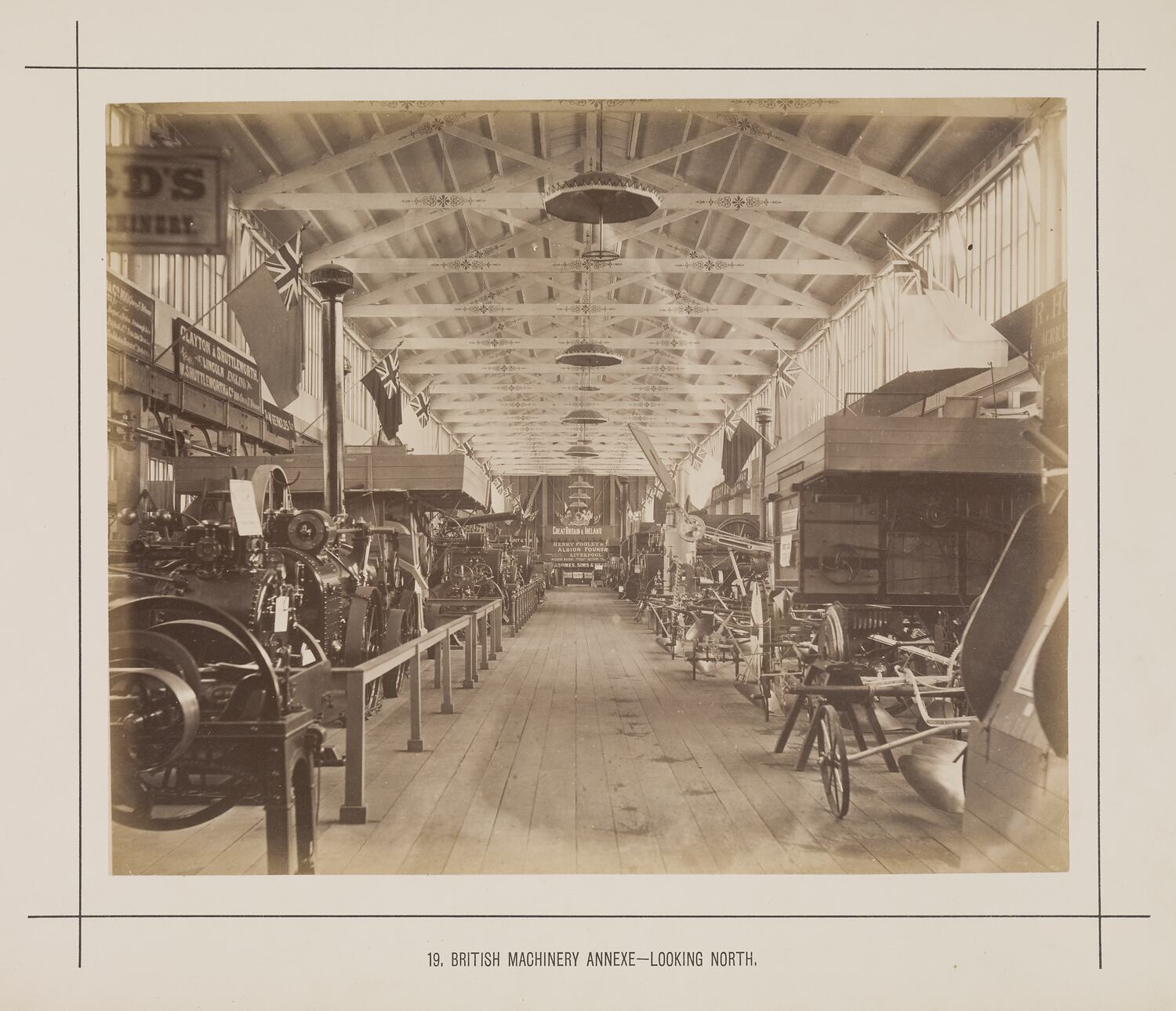 View looking northwards along the British Machinery Annexe at the 1880 Melbourne International Exhibition held at the Exhibition Buildings, Carlton Gardens, between 1 October 1880 and 30 April 1881.