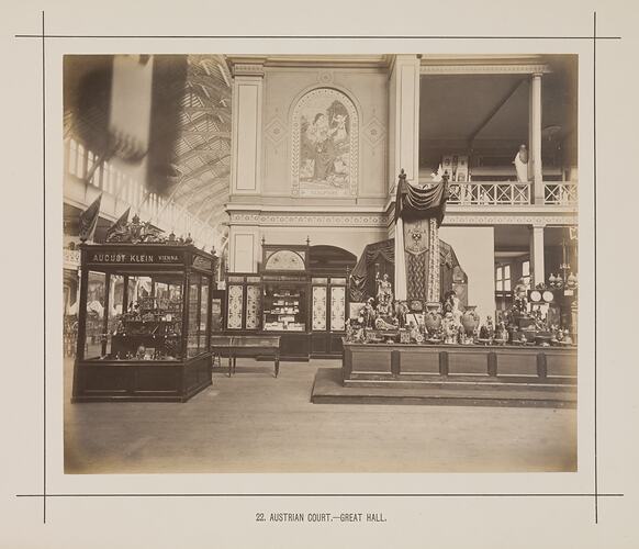 The main avenue was the central corridor that extended through the temporary annexes, leading northwards from the main permament Exhibition Buildings. Many of the major European countries had their courts situated on the western side of the main avenue, while the eastern side included exhibits from smaller countries and from other Australian colonies. The Austrian Court was at the far north-west corner of the temporary annexes, next to the Italian Court. Although not reflected on contemporary floorplans of the exhibition layout, it is evident from this photo that not all of the Austrian exhibitors could be accomodated within the Court space allocated, some displaying their produce in the Great Hall.