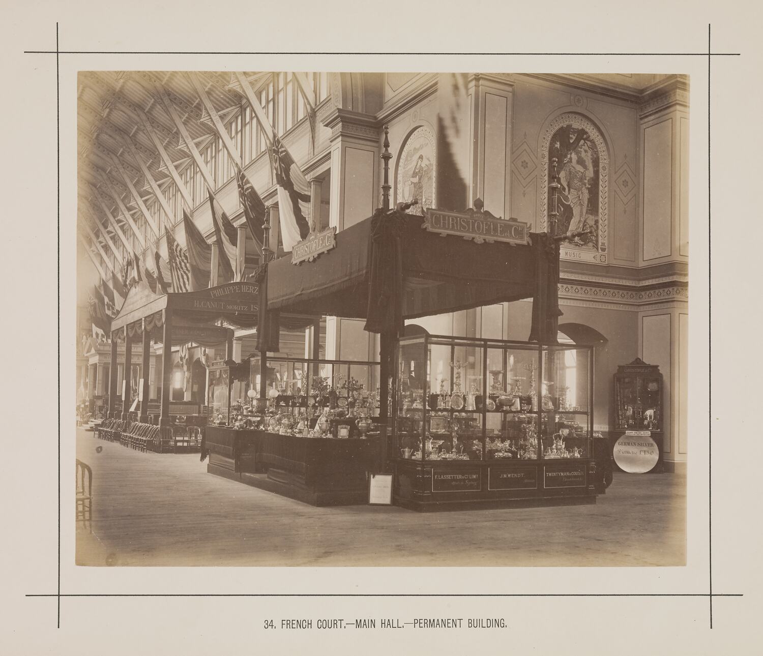 Printed in black ink on card below the photograph: '34. FRENCH COURT. - MAIN HALL. - PERMANENT BUILDING.'