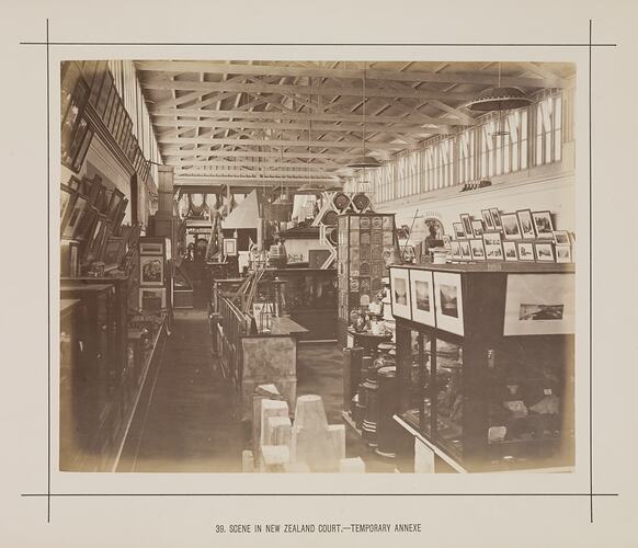 Printed in black ink on card below the photograph: '39. SCENE IN NEW ZEALAND COURT. - TEMPORARY ANNEXE'