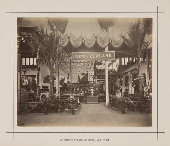 In addition to the main permanent Exhibition Building, two permanent annexes as well as a large, central wooden temporary annexe was constructed to house the courts of various countries, or to include larger items from countries already represented in the main Building. The New Zealand Court was bordered by Queensland on its northern side and South Australia to its south, and extended from the main avenue eastwards, offering an exhibition space approximately 250 feet (76.2m) long by 33 (10m) feet wide.