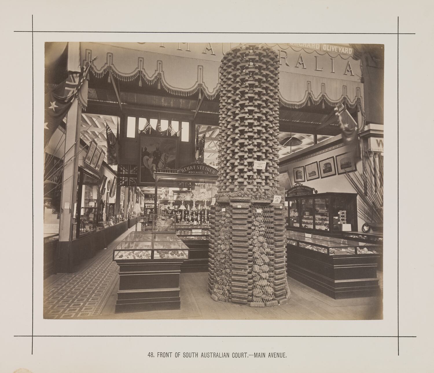 In addition to the main permanent Exhibition Building, two permanent annexes as well as a large, central wooden temporary annexe was constructed to house the courts of various countries, or to include larger items from countries already represented in the main Building. As one of the smaller Australian colonies, South Australia had only one court allocated to them, in the middle of the temporary annexe between New Zealand and Tasmania, West Australia and New South Wales whose irregular shaped courts meant that they all bordered South Australia.