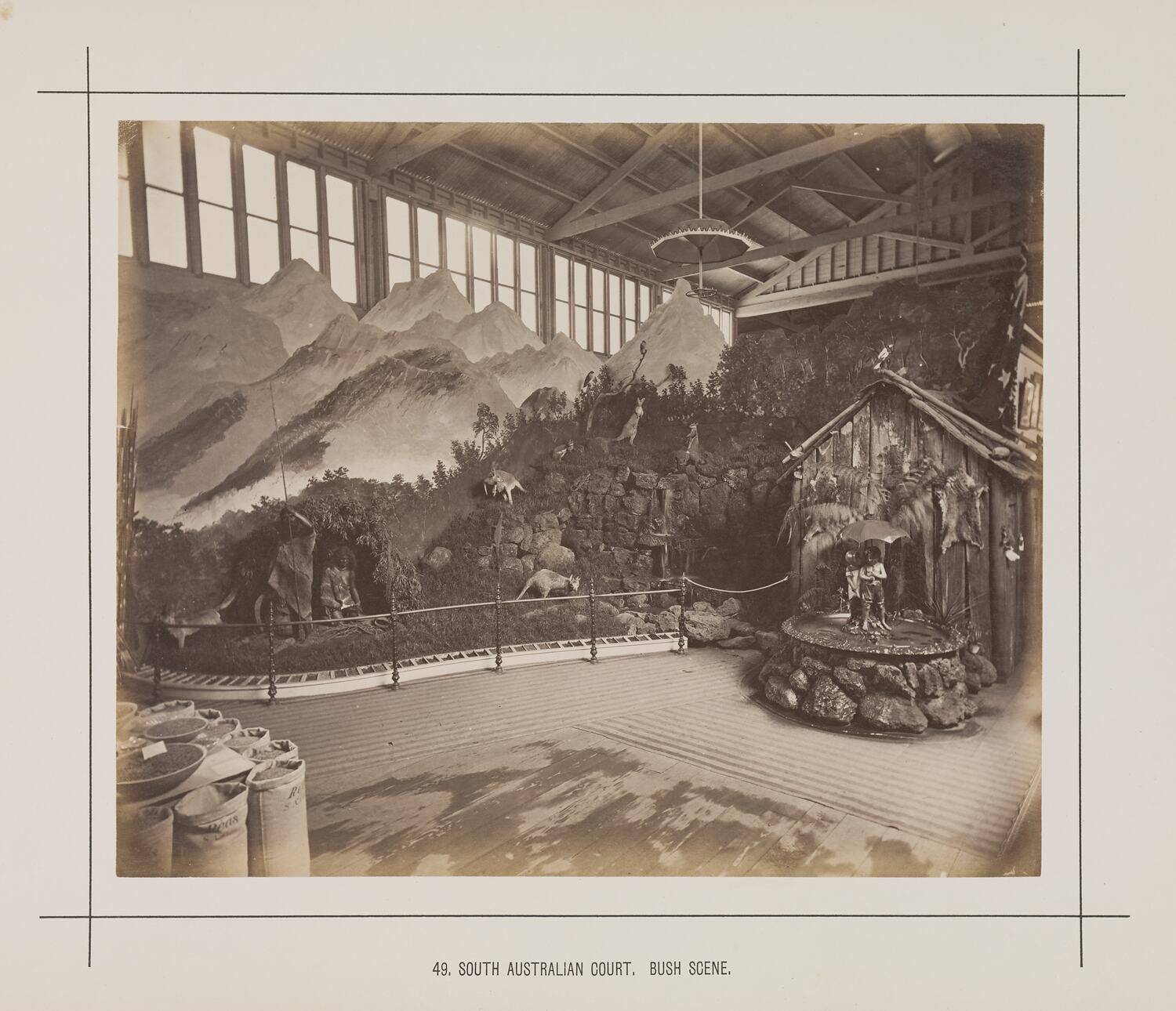 The 'Bush Scene' diorama, with its inclusion of almost European Alp-like mountains in the background, taxidermied kangaroos and models of Australian aboriginals quickly became a main attraction of the court, and indeed the exhibition. It was subsequently published as a woodblock illustration in both the Illustrated Australian News and Australasian Sketcher, as well as being photographed by renowned Melbourne photographer, Charles Nettleton.