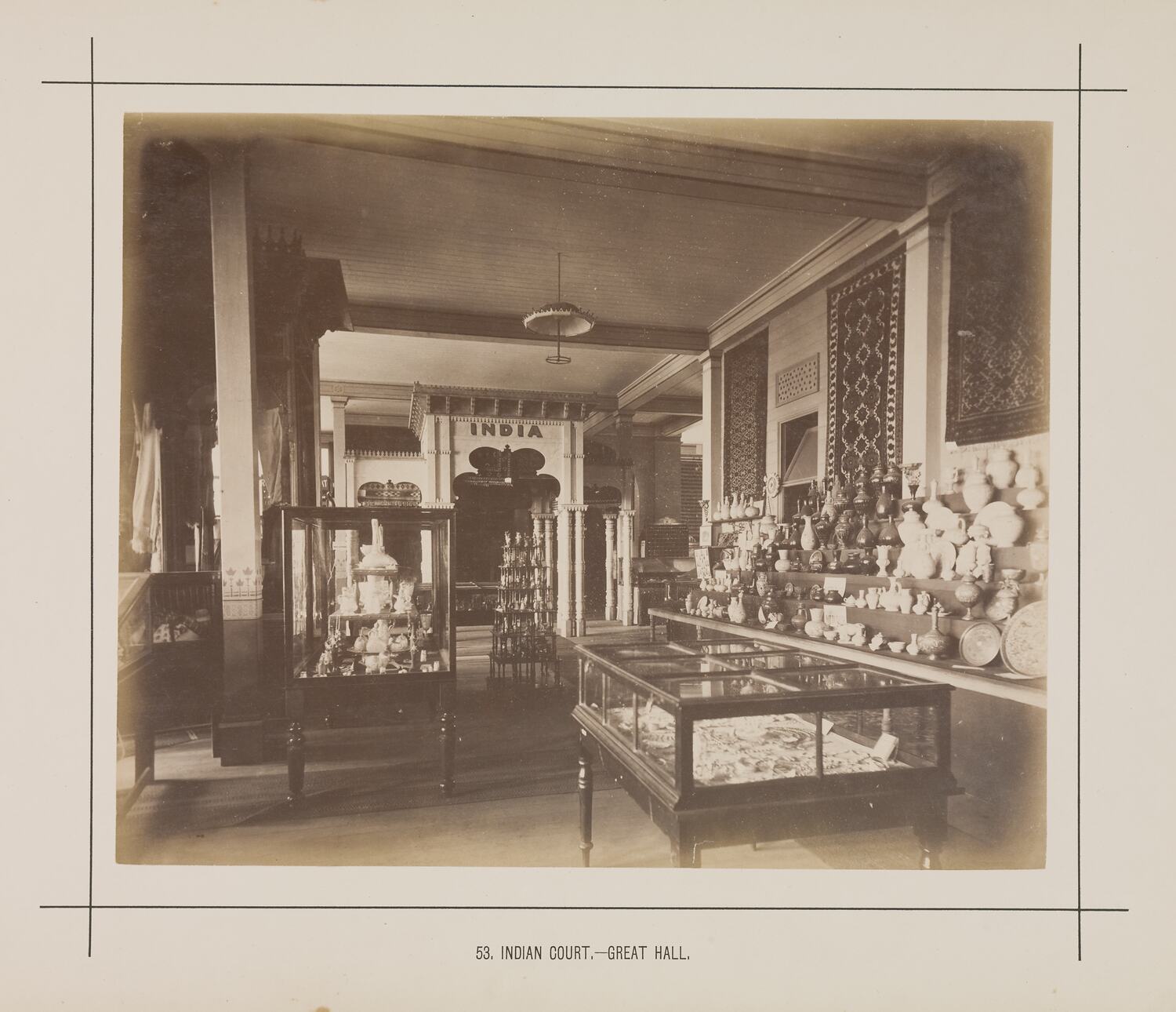 Printed in black ink on card below the photograph: '53. INDIAN COURT. - GREAT HALL.'