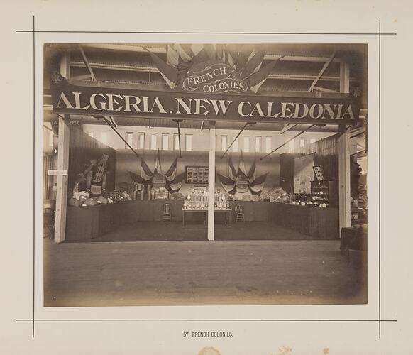 Although France had the second largest allocation of exhibition space on the eastern side of the central temporary annexe, it still proved insufficient to accomodate the display of material from Algeria and New Caledonia which, although not extensive, had to be accomodated in the Western Machinery Annexe, probably on the eastern wall. Because of its relatively close proximity to Australia, by 1880 a considerable trade was occuring between New Caledonia's capital, Noumea, and Australia.