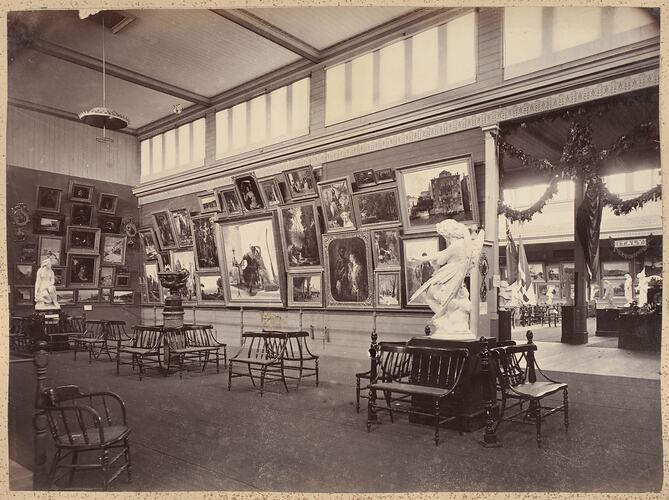 View of the Italian Fine Art Gallery display on the southern wall of the eastern nave, and extending across the eastern balcony, in the Great Hall at the 1880 Melbourne International Exhibition held at the Exhibition Buildings, Carlton Gardens, between 1 October 1880 and 30 April 1881.