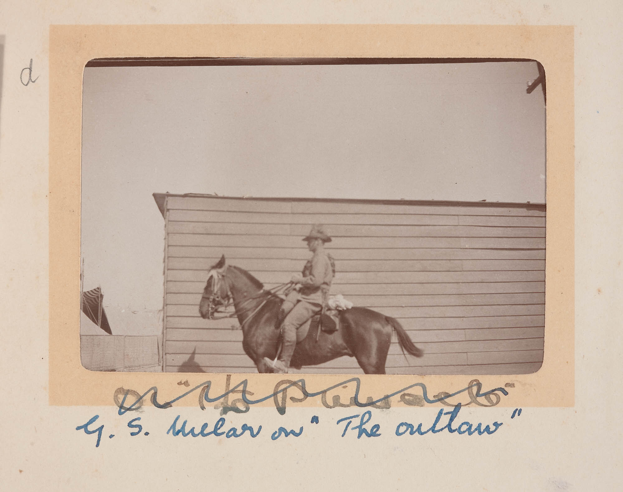 Hand-written in pencil on the support next to the top left corner of the photograph: 'd' Hand-written in black ink and crossed out in blue ink on the support underneath the photograph: '(illegible)' Hand-written in blue in on the support underneath the photograph and an earlier inscription: 'G.S. Millar on "The outlaw"'