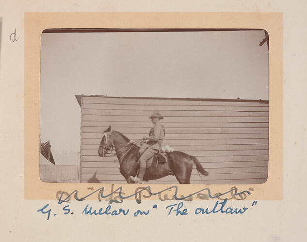 Image depicting Trooper Millar mounted on "The Outlaw." The Outlaw was a remount cast off. Remounts (commonly called "Walers" because of their origins in New South Wales) were horses bought by the Commonwealth from graziers and breeders. Many of these horses did not have names and it is therefore likely that it was Trooper Millar who gave his horse the name "The Outlaw."