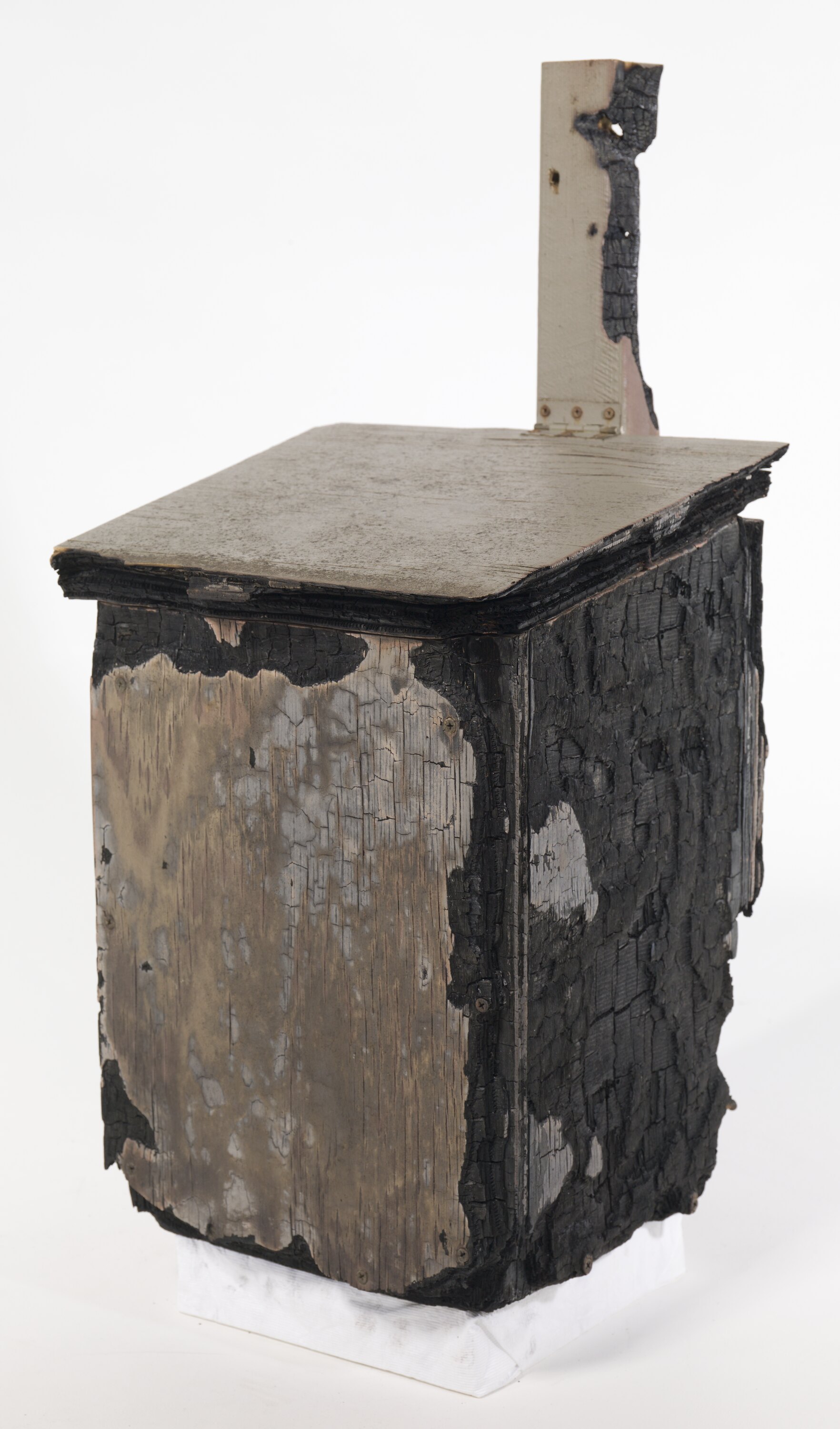 The nest box was constructed using double thickness marine ply wood. The object has been damaged by fire as a result of the Black Saturday bushfires.
