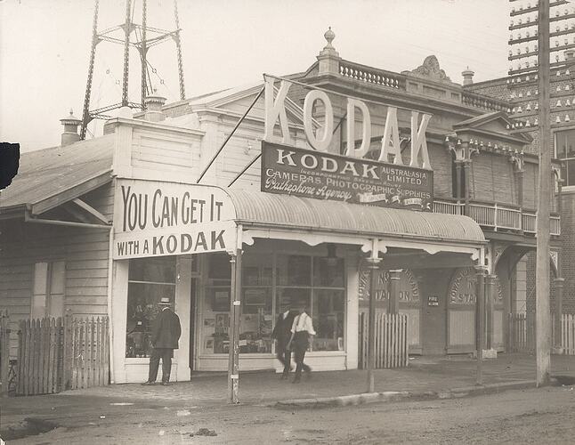 Exterior of timber, single storey Kodak shop with dirt road in the foreground and a firestation and telegraph pole in the far right of the image. Exterior of a building. One man is looking in one of the front windows at a gramophone display. Another two men are walking on the footpath.
