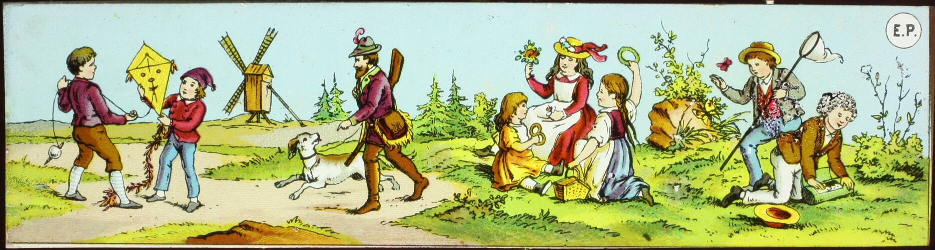 Children's Play, Dogs, Gardens, Insects, Kite Flying, Recreation, Recreation Activities, Toys, Windmills, Lantern Slides