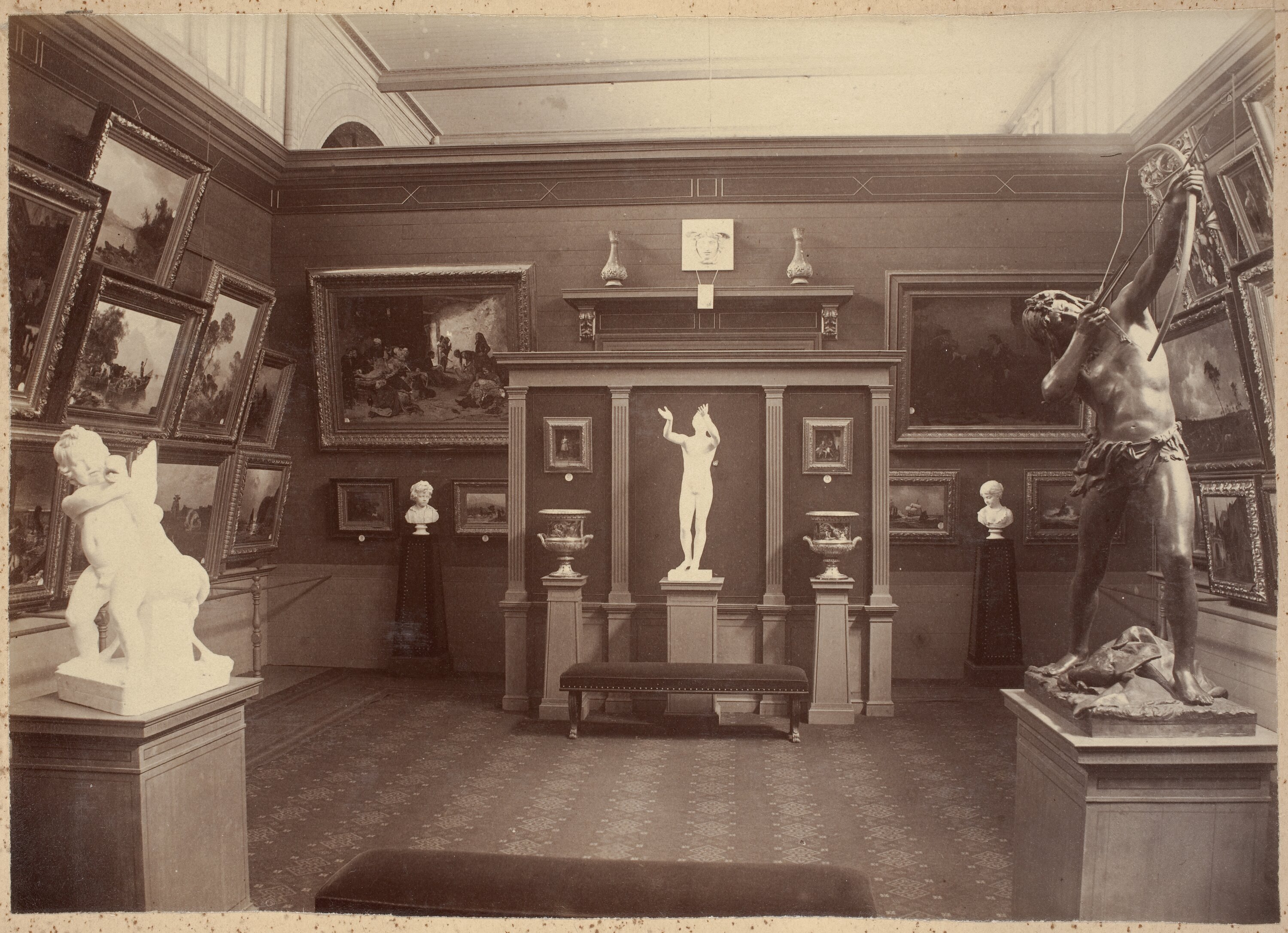 Germany exhibited almost 100 oil paintings, the majority of which had been shown the previous year during the 1879 Sydney International Exhibition. Several of the works can be identified in this photograph by their catalogue labels, including possibly Louis Douzette's 'Venice - Moonrise" (no.17), on the right behind the statue of an archer, J. Munsch's 'A Politician' (no.63), W. Marc's 'The Music Lesson' (no.54), and J. Huth's 'Fastnet Rock Lighthouse, on the Irish Coast' (no.35). Several large Meissen porcelain vases also adorned the German gallery, visible atop two pedestals in the centre of this photograph.