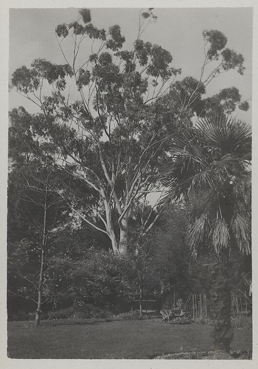 Handwritten in black ink on the back of photograph: 'Manna gum still is there, / extreme left is the sapling / of what is now a big / oak, right is a heavy palm / which was at SE corner of / house and there was another / by the SW corner / about 1935' Printed in black ink on back of photograph: 'VELOX.(repeated)' Rubber stamped in black ink on back of photograph: '6 33'