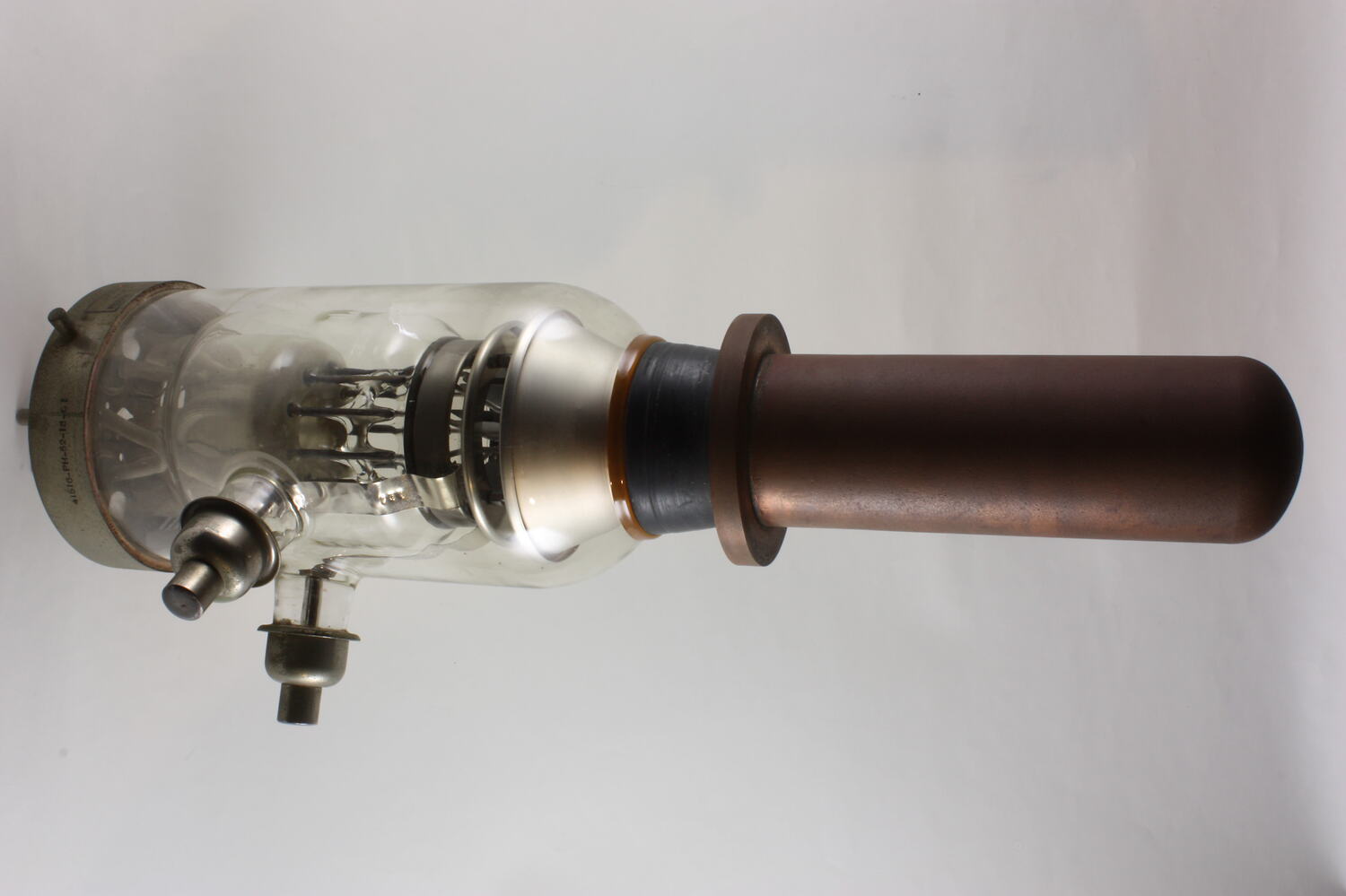 Water cooled transmitting triode with a plate dissipation rating of 40 kW. It has a multi strand filament allowing operation from DC, single, three and six phase AC. The pure tungsten filament consumes about 5.6 kW.