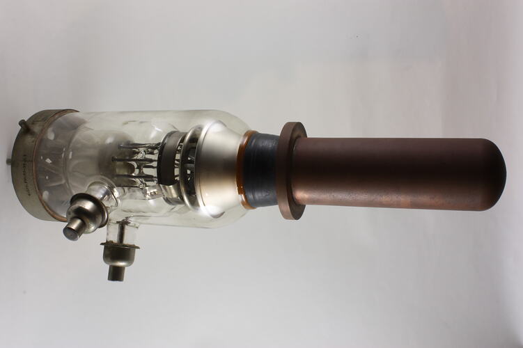 Cylindrical glass bulb with six pin metal base at one end and long copprer tube and ring (water cooled anode) at other end. Two flanged metal side connections on glass bulb. Broken parts loose inside.