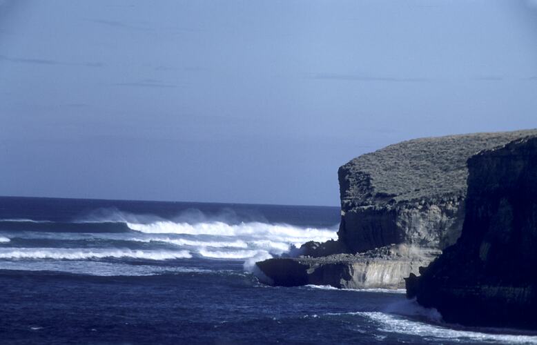 In the foreground rugged cliffs of coastline pictured in strong sunlight creating dark shadows, waves creating spray in the background.