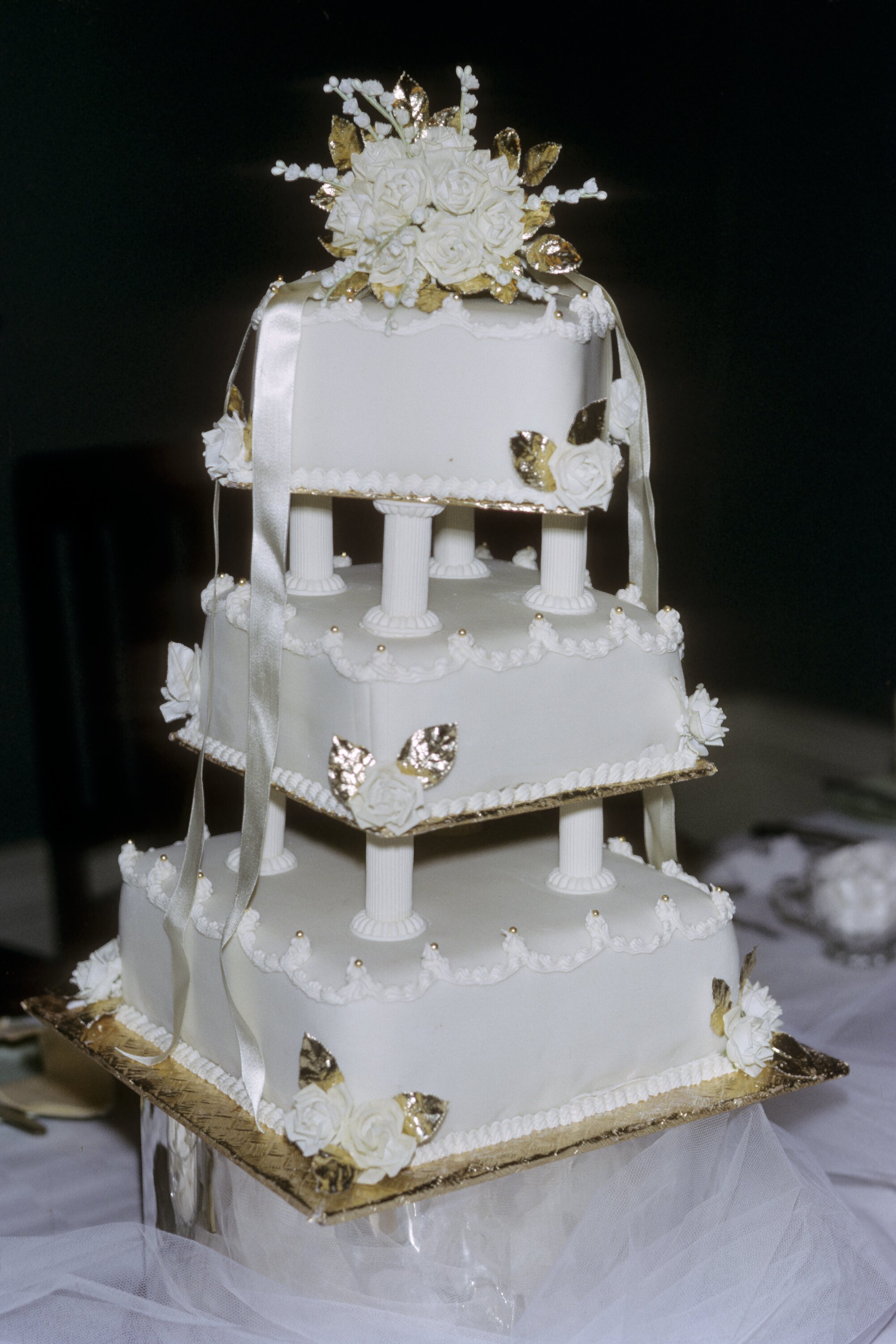 Three tiered wedding cake in place on head table for reception,.
