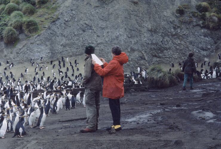 Woman in red jacket uses a man's back to rest note book while studying large number of penguins in front of them. A third person walks away from them with back to camera and ground can be seen in space between legs.