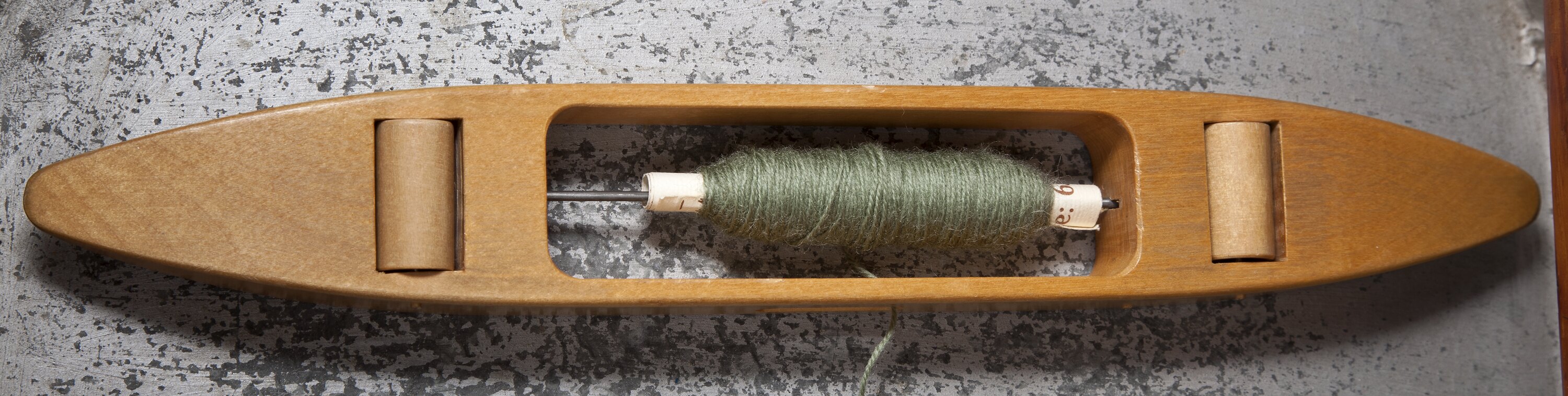 Wooden shuttle used for weaving. The shuttle is smooth and has pointed ends. A metal rod passes through the wide hole in the centre of the shuttle. Another hole in the side of the shuttle permits thread to pass out of the shuttle and unravel when slid across the shed the space made between the warp threads.