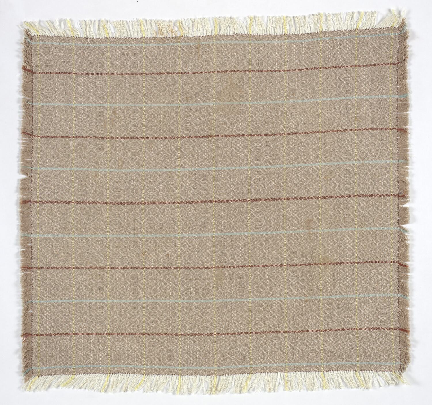 Table mat woven by Anna Apinis in Sydney in the 1970s and featuring her own design. Anna Apinis was born in 1913 in Latvia. She attended weaving lessons in Liepaja in Latvia from 1930 to 1933 and spent hours at the nearby Liepaja Ethnographic Museum, recording traditional fabric designs in her notebooks. Anna had a loom constructed for her by fellow male survivors of World War II at Memmingen, a Displaced Persons camp in Germany. In 1950 Anna migrated to Australia, with her father Ernest, husband Ervins, their son Eriks, and her precious loom. She became one of the few suppliers of fabric for Latvian national costumes in Australia in the 1950s and 1960s, and exhibited her weaving nationally, at exhibitions and Latvian cultural festivals. She fulfilled her dream to keep her cultural traditions alive through her daughter Anita who continues to weave to this day.