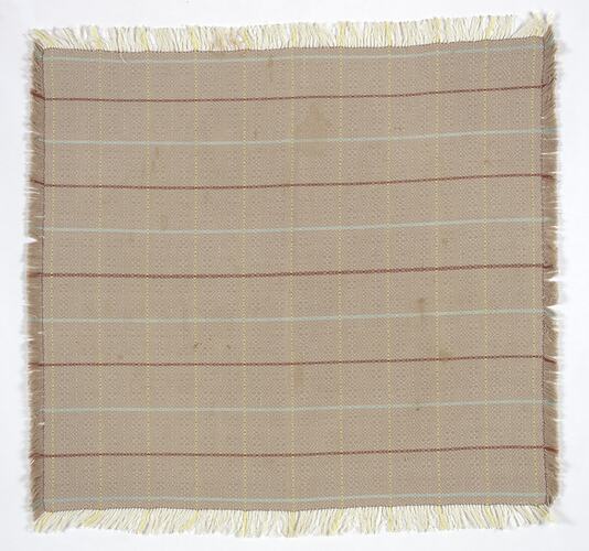 Woven table mat in the shape of a square with tasseled edges. Mat is woven with a repeated pattern in light beige thread with criss crossing thin bands in light blue, brown and yellow.