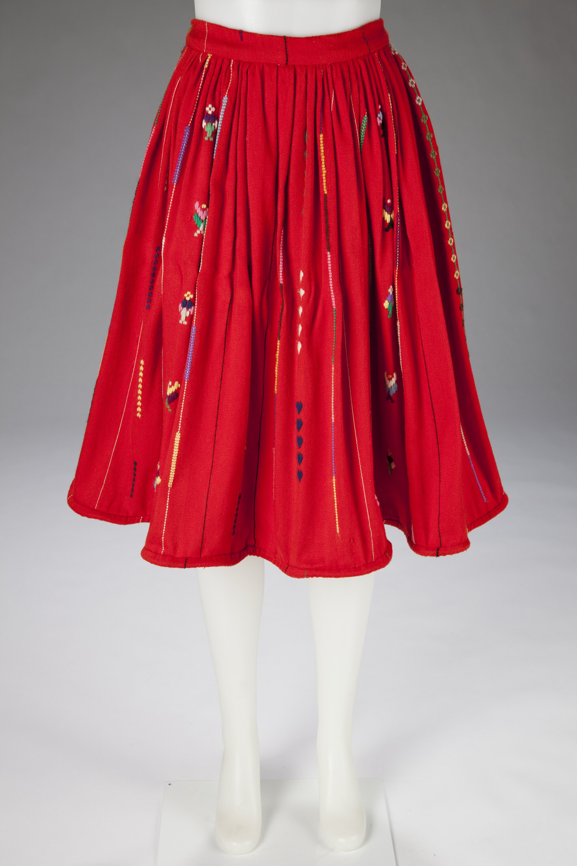 Woven skirt with waist band. Skirt is red with woven bands in body of varying colours, sizes and types of motifs running vertically from the waist band.