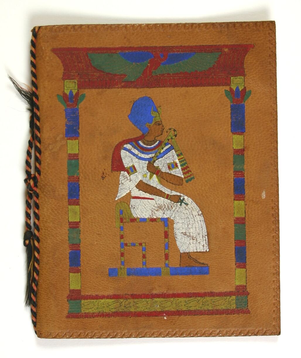 Leather wallet for holding paper money with a painted image of a Pharaoh on the front, bought by Sister Selina Lily (Lil) Mackenzie as a souvenir of her time in Egypt during World War I. Lil nursed at the 1st Australian General Hospital from October 1915 to January 1917. The 1st AGH was located in the Heliopolis Palace Hotel on the north-eastern edge of Cairo.