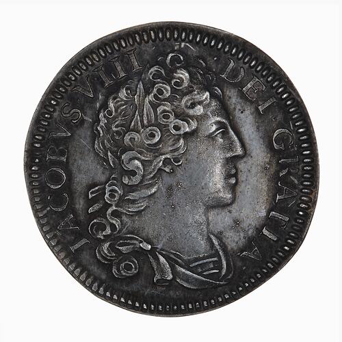James landed in Scotland for his coronation in 1715. The coronation was to be at Scone on 23 January 1716 and dies were prepared for his coinage by Norbert Roettiers in Paris. He returned to France without being crowned in February. This piece was among those struck from the original dies for the gold guinea, in silver in 1828 by Matthew Young - then the dies were defaced.
