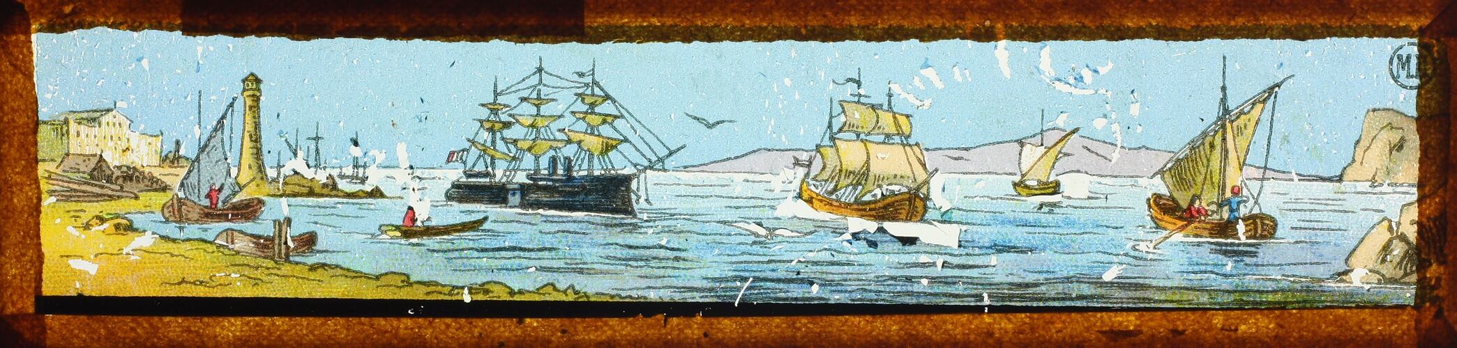 Colour image of coastal scene depicting sailboats, a row boat, a sailing ship and a steam ship. A lighthouse and building a situated on the left.