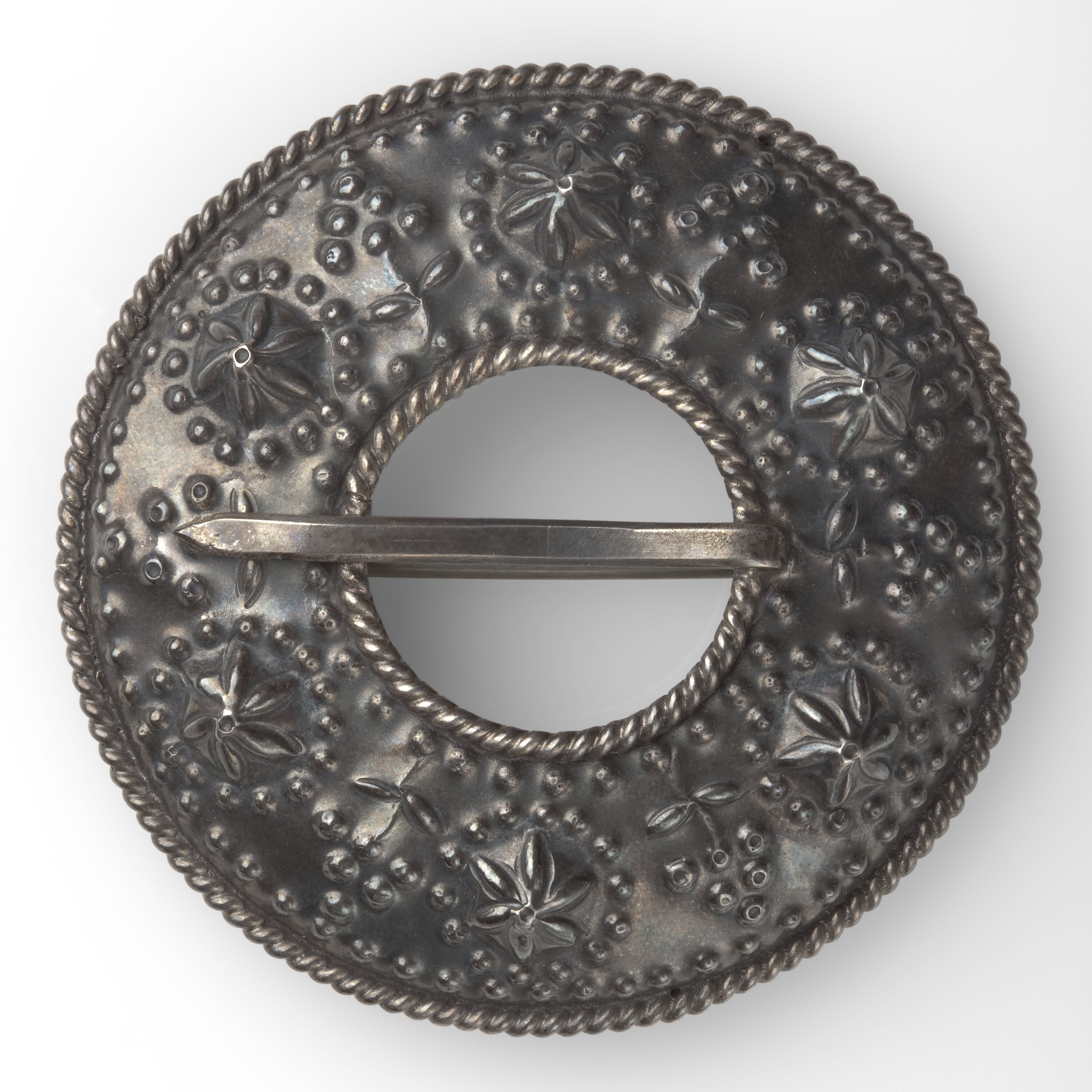 Large sized metal brooch, one of three in descending size order and identical design. Round with inner round hole, and a metal pin welded across the hole. A metal pin is attached at the back of each brooch for attaching to garment. The brooch has a series of relief patterns, round stars and studs with a rope border around the outer and inner edges.