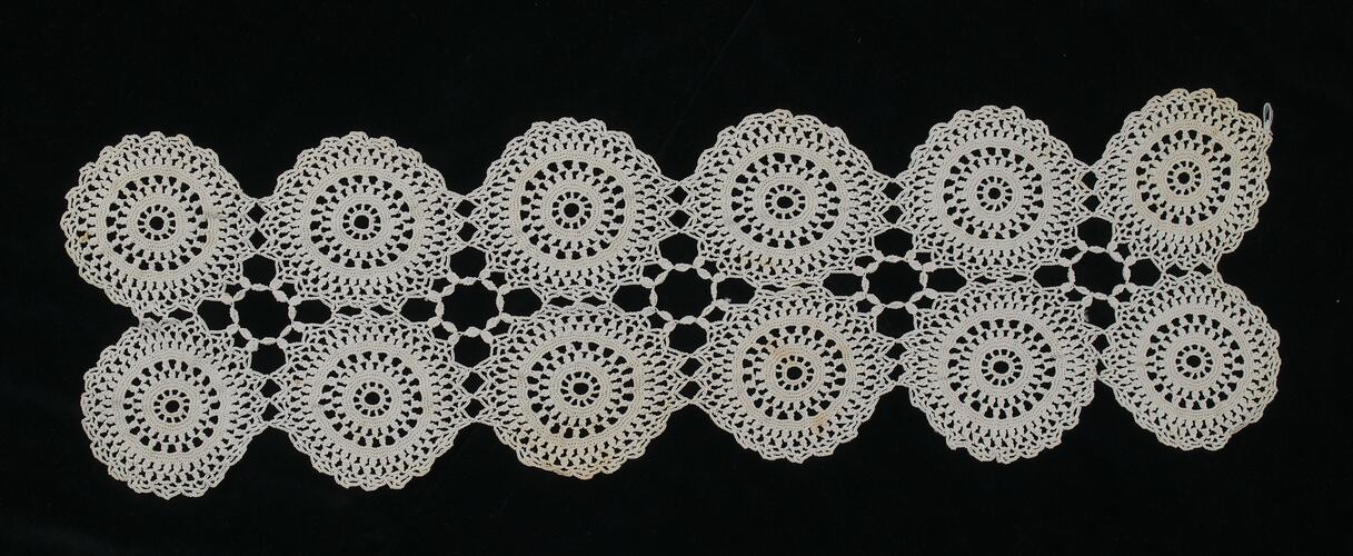 Pair of off-white table cloths, each made from circular pieces of crochet. Made by Elaine Colbert in the 1940s, probably for her glory box. She used one for her bedside table and the other for her chest of drawers; she may have also (or alternatively) used them as a dressing table set. Other contents of Elaine's glory box included bed linen, some given by her aunts, and many items from her mother, including a good knife - her mother 'seemed to have two of everything'.