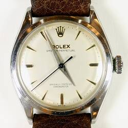 Face marked: ' Rolex Oyster Perpetual / Officially Certified Chronometer'. Rear of case engraved with initials: 'G.M.K.' Side of case engraved 'G. M. Kersey'.