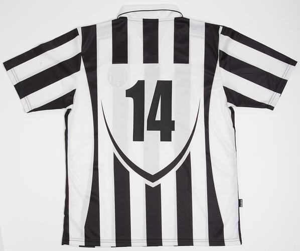 Soccer jersey with black and white stripes. The jersey comes from the Brunswick Zebras an under 18 girls soccer team made up of a diverse group of girls brought together in 2009. Under the Community Coaching Program and a partnership set up with Spectrum Migrant Resource Centre in Preston, girls from a Muslim background were blended with girls who had already played with the club. The team continued to play together in 2010 and have formed strong bonds with each other.