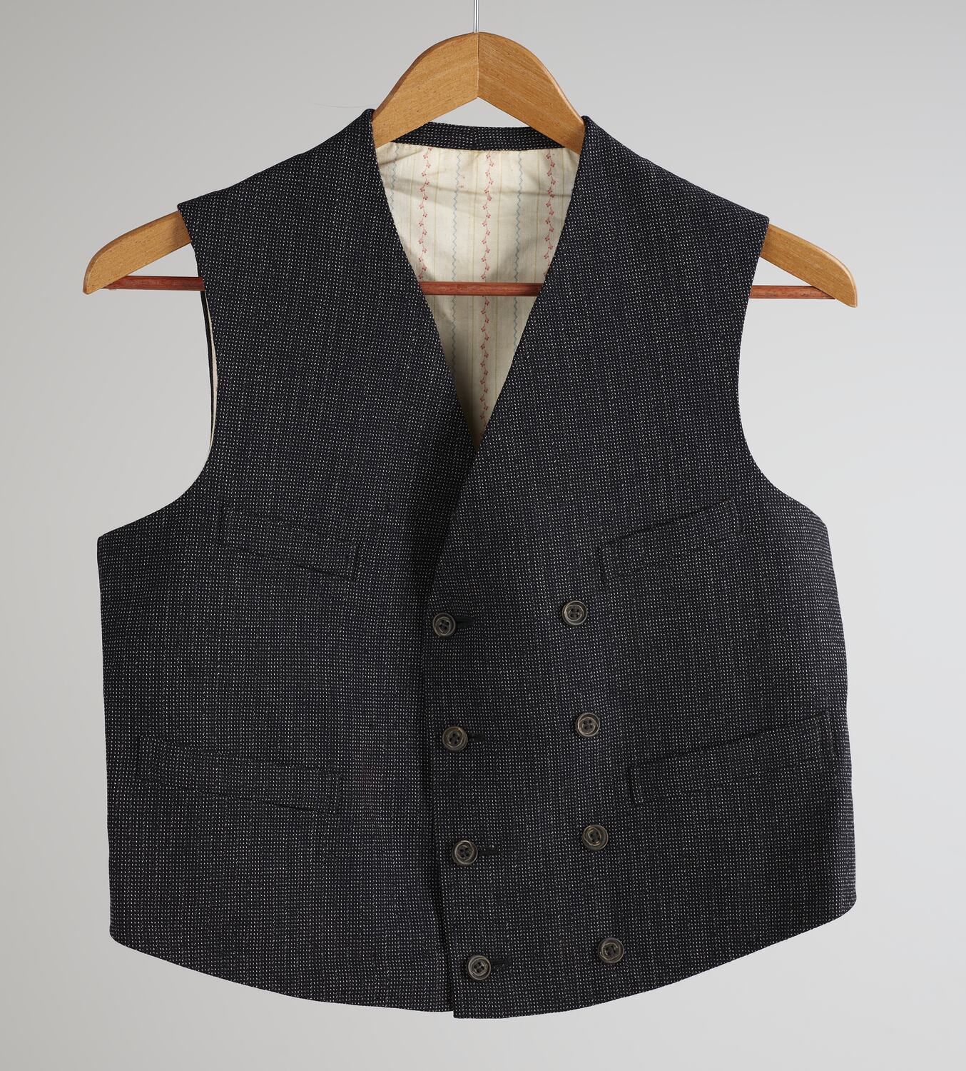 Double-breasted waistcoat with a woven black and white woollen front and a black cotton back. There are eight buttons down the front and one button on the inner lining. The waistcoat has four front pockets and a black cotton adjuster on its back, which is fastened with a black metal buckle. It is lined with white cotton with coloured stripes.