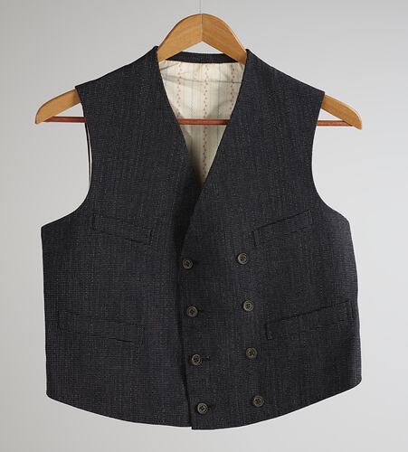 Black and white woollen waistcoat made by Ichizo Sato, a Japanese tailor in South Yarra, Melbourne, circa 1910. It is part of a three piece suit worn by Japanese immigrant Setsutaro Hasegawa and one of a number of Setsutaro's suits held in the Museum's collection.