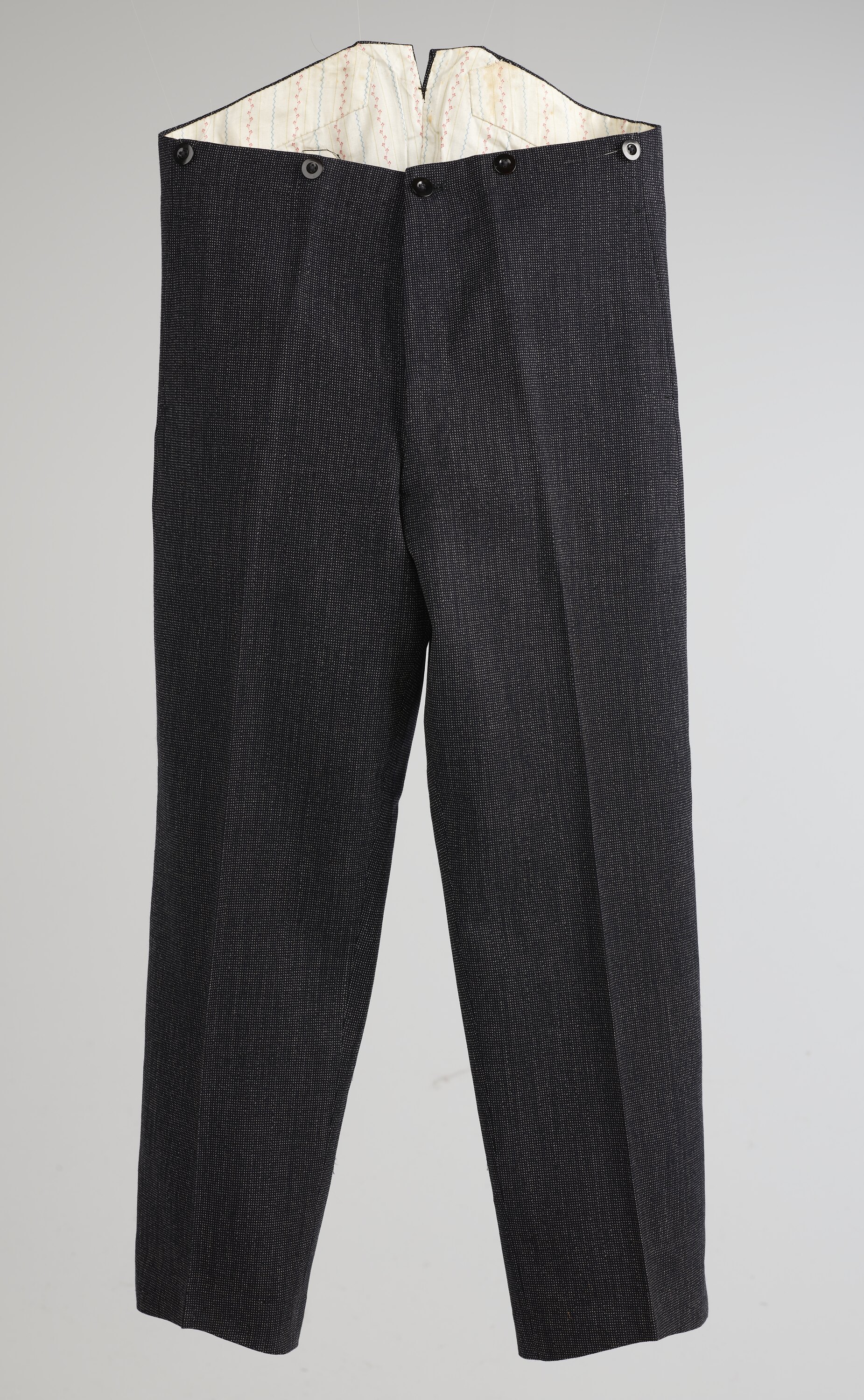 Trousers made from woven black and white wool, with two front pockets. The fly closes with five black buttons and there are four buttons on the front waistline and two buttons on the back waistline to attach braces. There is a woven black and white wool adjuster on the back, which is fastened with a black metal buckle. The waistline and gusset are lined with white cotton material with stripes, and the pockets are lined with beige calico.