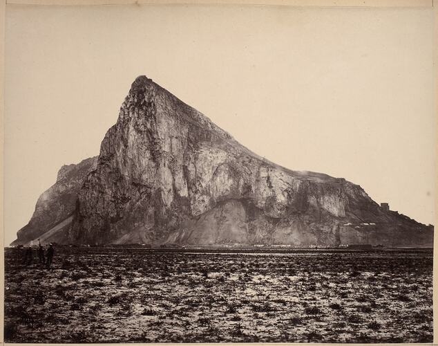 View of Gibraltar on the Iberian Peninsular. There are three men pictured to the left standing in the open plains, in front of the Rock of Gibraltar in the background, circa 1870.